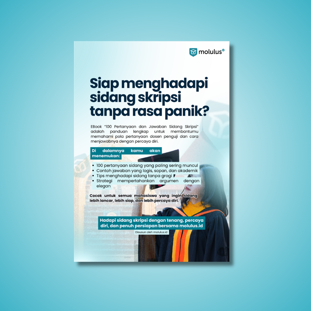 100 Pertanyaan & Jawaban Sidang Skripsi by Molulus adalah panduan lengkap berisi kumpulan pertanyaan yang paling sering muncul saat sidang skripsi lengkap dengan contoh jawaban sistematis, akademis, dan mudah dipahami. Disusun berdasarkan pola pertanyaan dosen penguji dari berbagai kampus di Indonesia.